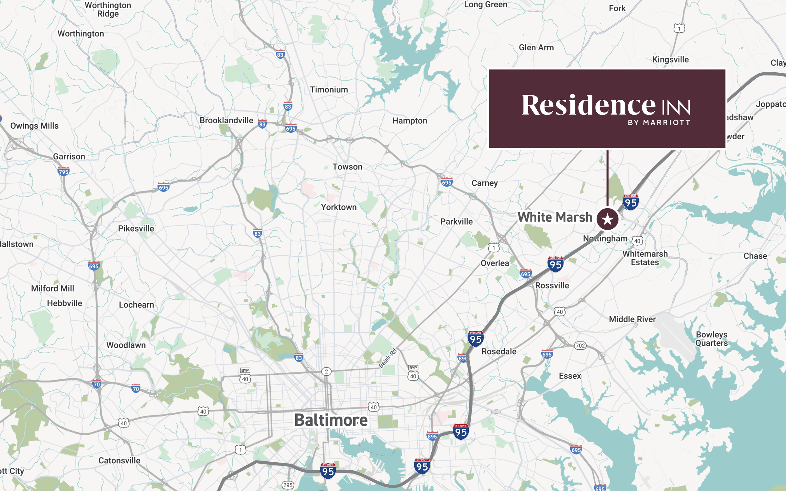 Hodges Ward Elliott (“HWE”) is pleased to offer the opportunity to acquire the Residence Inn Baltimore White Marsh (“Property” or “Hotel”), located just off Interstate 95 in Baltimore’s northeast growth corridor, less than 15 miles from Downtown. With a key location within the White Marsh Town Center master-planned development, the Hotel is positioned near major retail hubs like White Marsh Mall and The AVENUE at White Marsh, as well as over 19 million square feet of industrial and office space within a five-mile radius.